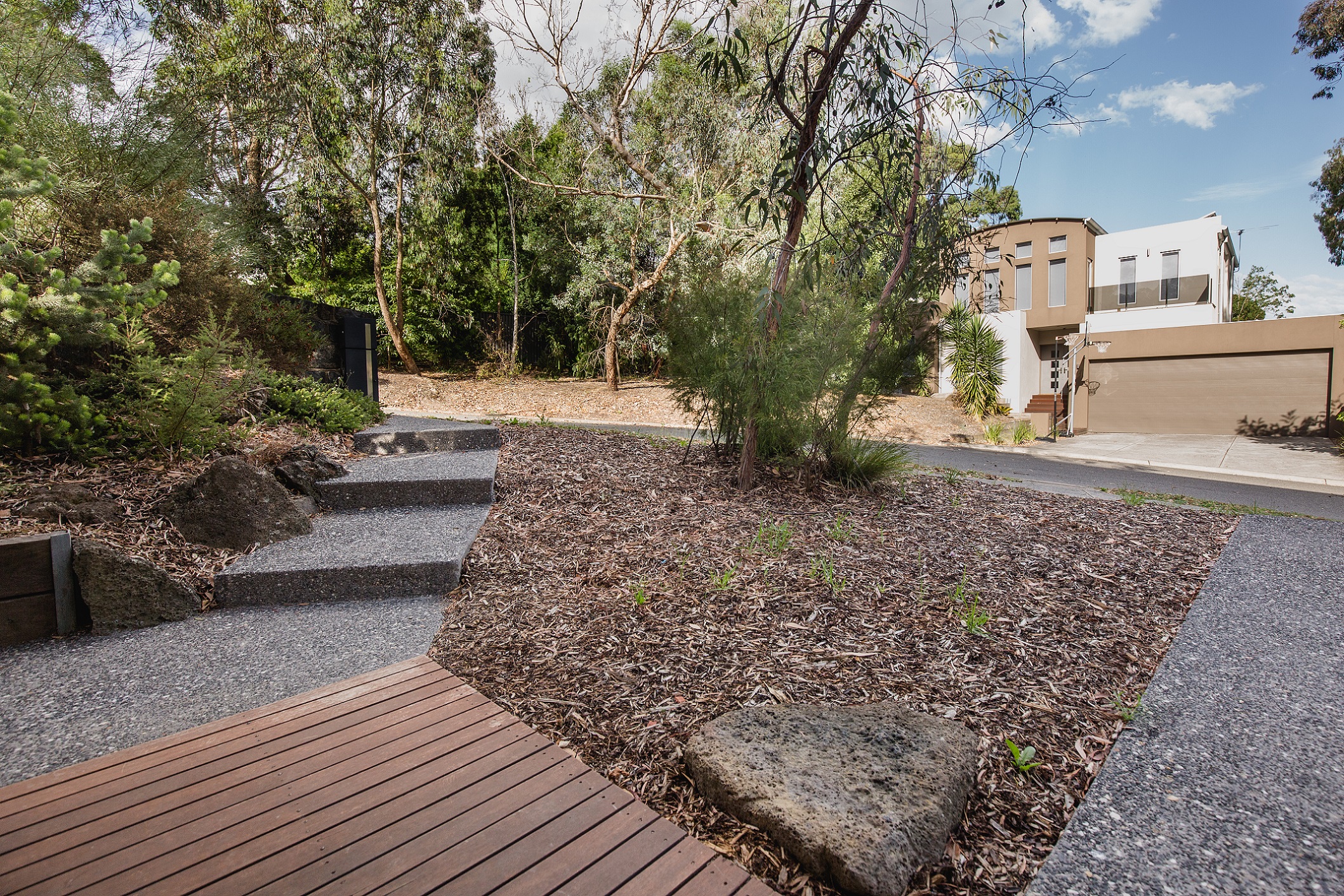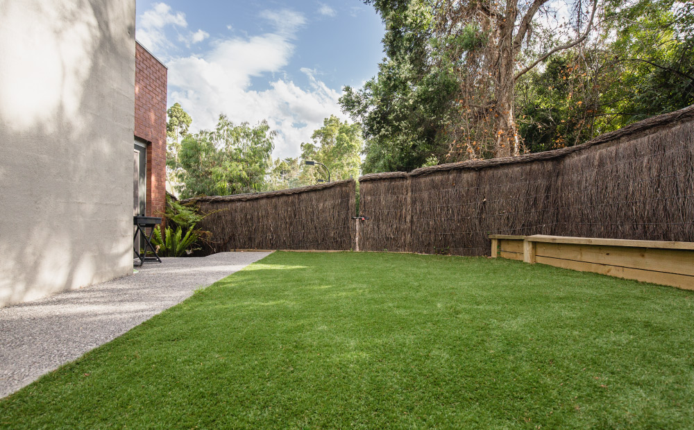 This backyard transformation in Vermont was originally an empty space and we incorporated a fake turf play area for the kids, exposed aggregate concrete path and a retaining bench seat for mum and dad to sit on.